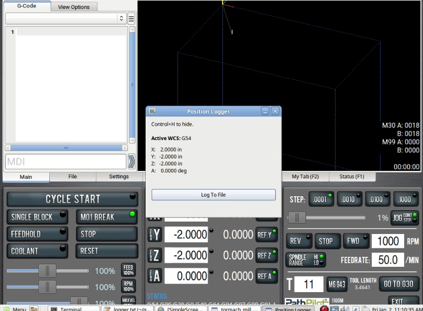 | POSITION LOGGER (TO FILE) This plugin may be suitable for those reverse engineering or otherwise building code from hand. You can move your machine to position and quickly log that position to file. It'd be useful like if you had to write a drilling cycle program and didn't want to hande type a bunch of positions in. Uses the active WCS and supports G20 and G21. Logs to logger.txt and you can change the format of what's logged (G1 F50 before the coords, G0, nothing at all, etc) with minor python editing. |